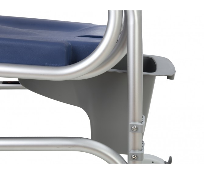 Funciona como cadeira sanitária e de banho, com um assento de conforto, com buraco e recetáculo para fins sanitários. Se o utilizador preferir ir à casa de banho, pode transportá-lo na cadeira, retirar o recetáculo (aparadeira) e encaixar a cadeira na sanita de forma a fazer as necessidades diretamente na sanita. Serve também como cadeira de banho, sendo fabricada em alumínio.