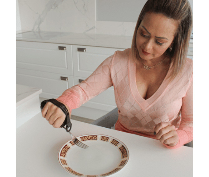 Equipado com um anel em D e uma cinta elástica, é indicado para todos os tamanhos de mãos, tornando a colocação e retirada dos objetos uma tarefa simples, além de poder ser utilizado por pessoas tanto destras quanto canhotas.