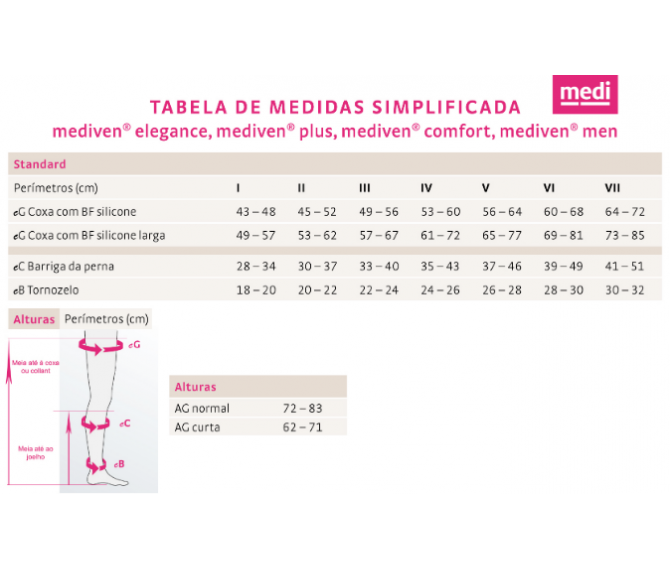 Consulte o catálogo para informação adicional e a tabela de medidas para as instruções de medição e escolha correta do tamanho. O tamanho das meias elásticas não é escolhido a olho nem pelo tamanho do sapato. A perna deve ser corretamente medida e essa medição irá corresponder a um tamanho específico da tabela.