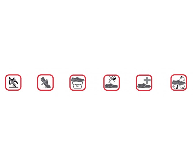 É antiderrapante, absorve energia no calcanhar, altamente respirável, resistente ao rasgamento e à abrasão.